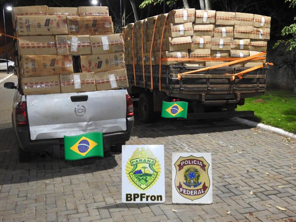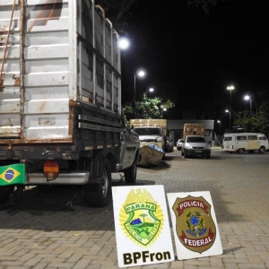 No local foram apreendidos 01 caminhão, 02 caminhonetes e 01 veículo carregado com aproximadamente 400 caixas de cigarros contrabandeados, prejuízo de aproximadamente R$ 550.000,00 ao crime organizado da região.