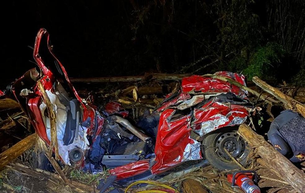 Cinco pessoas morrem após acidente entre carros e caminhão carregado de toras — Foto: PRE