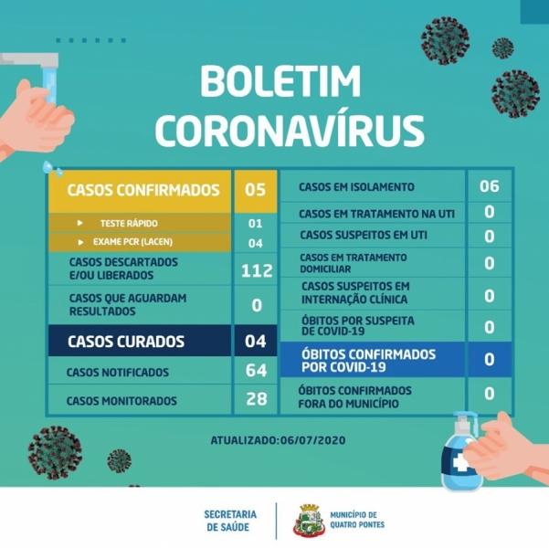 No boletim desta segunda-feira (6), o município registra cinco casos confirmados, sendo um por teste rápido e quatro por meio do exame PCR do Laboratório Central do Estado (Lacen-PR), incluindo 112 casos descartados e/ou liberados da quarentena, nenhum caso aguarda resultados de exame, além de quatro casos curados, 64 casos notificados, 28 casos monitorados e seis casos em isolamento.