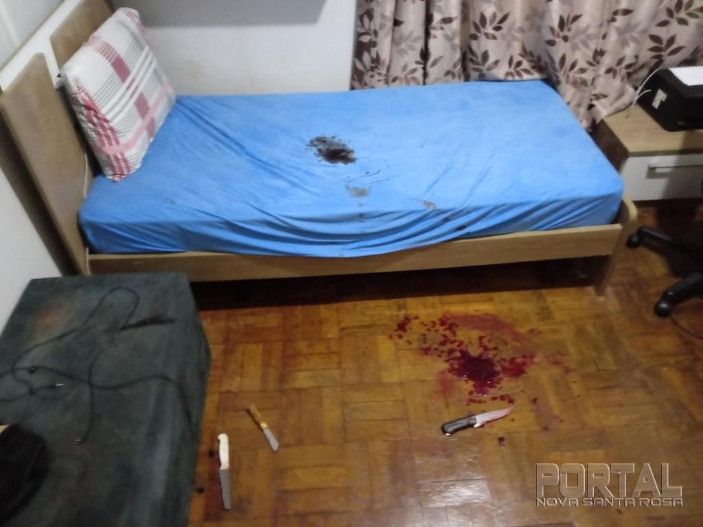 Durante o deslocamento da PM foi utilizado sinais sonoros e luminosos para amparar a ação policial e chegar o mais breve possível, no local, no interior da residência após passar pela sala do hall de entrada, ao lado, em um dos cômodos, o piso estava com diversas trilhas de gotejamento e poças de sangue, na cama de solteiro o lençol de cor azul estava manchado com sangue, foram localizadas duas facas pequenas.