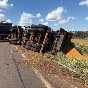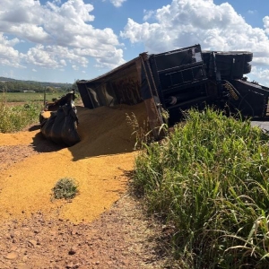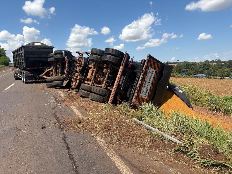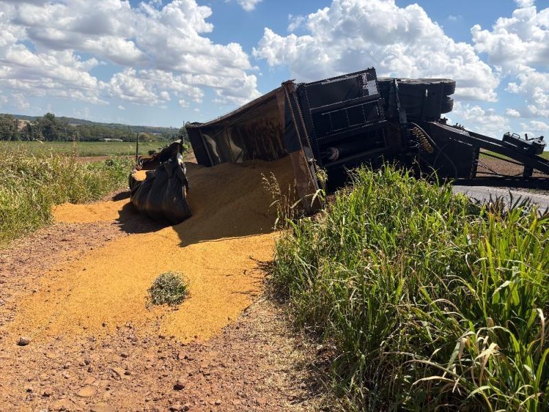 Não houve feridos, e a carga de farelo de milho transportada pelo veículo ficou espalhada em uma estrada rural, às margens da BR-163.