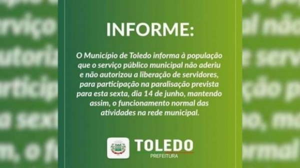 A Prefeitura de Toledo, por meio de nota, informou que as atividades na Rede Municipal de ensino funcionam normalmente na manhã de sexta-feira (14).