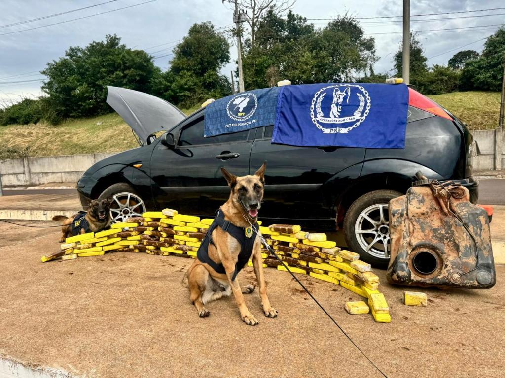 A primeira apreensão aconteceu na manhã de ontem (19), quando policiais abordaram um caminhão-guincho que transportava um automóvel. Com auxílio dos cães farejadores, foram localizados 48,1 quilos de maconha escondidos em compartimentos ocultos do veículo, como o tanque de combustível e os para-lamas. O passageiro, monitorado por tornozeleira eletrônica, foi preso em flagrante.