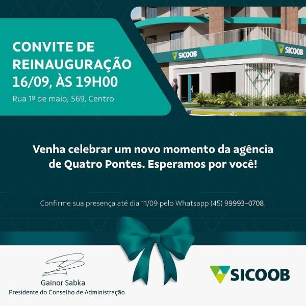 A cooperativa Sicoob convida toda a comunidade de Quatro Pontes para um momento especial: a reinauguração da sua agência local.