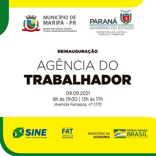 O Governo Municipal de Maripá por meio da Secretaria de Indústria, Comércio, Turismo e Desenvolvimento Econômico realiza nesta sexta-feira (9) a reinauguração da Agência do Trabalhador. Com a missão de se tornar o principal elo entre trabalhadores e empregadores, a Agência do Trabalhador passa a funcionar em sede própria e agora conta com equipe específica para o desenvolvimento das atividades.