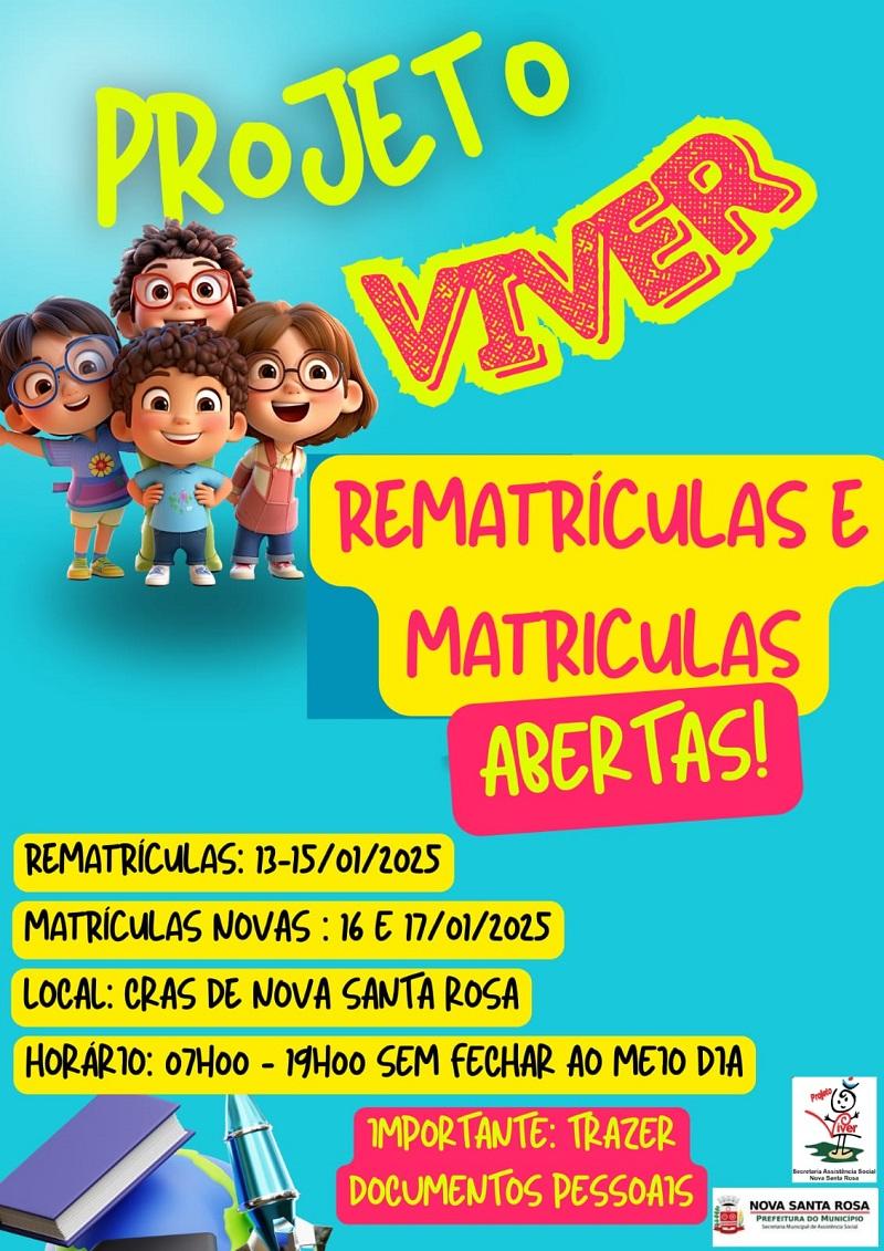 A Prefeitura de Nova Santa Rosa, por meio do CRAS (Centro de Referência de Assistência Social), informa que estarão abertas as rematrículas e matrículas novas para o Serviço de Convivência e Fortalecimento de Vínculos (Projeto Viver).