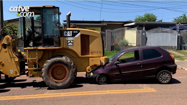 Batida entre uma retroescavadeira e um Fiat Palio foi registrada na região do bairro Universitário em Cascavel, na manhã desta sexta-feira (2).