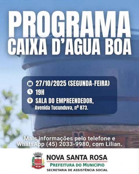 A Prefeitura de Nova Santa Rosa convida as famílias interessadas para participar da reunião ampliada do Programa “Caixa D’água Boa”, que acontecerá na próxima segunda-feira (27), às 19h, na Sala do Empreendedor (Avenida Tucunduva, nº 873).
