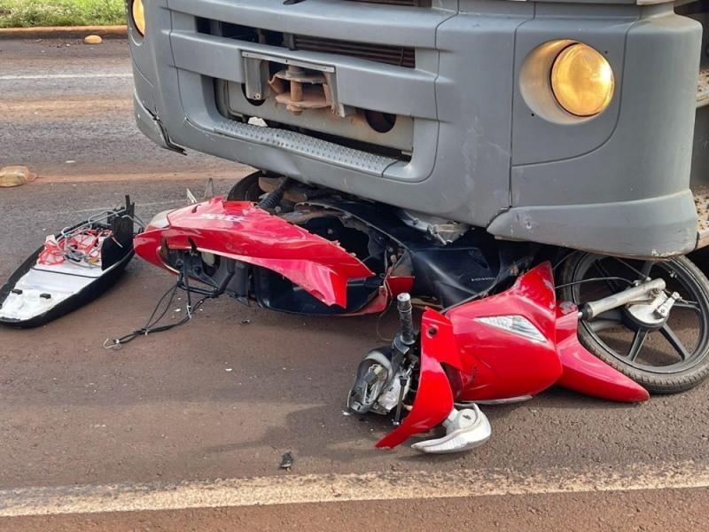 A condutora da moto usava um capacete aberto. A Biz parou debaixo da parte frontal do caminhão.