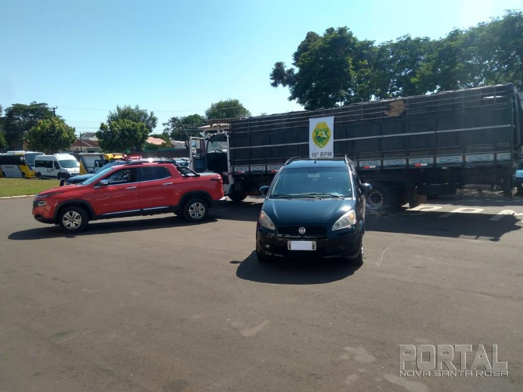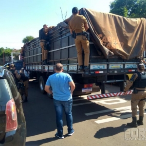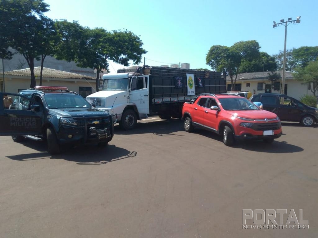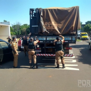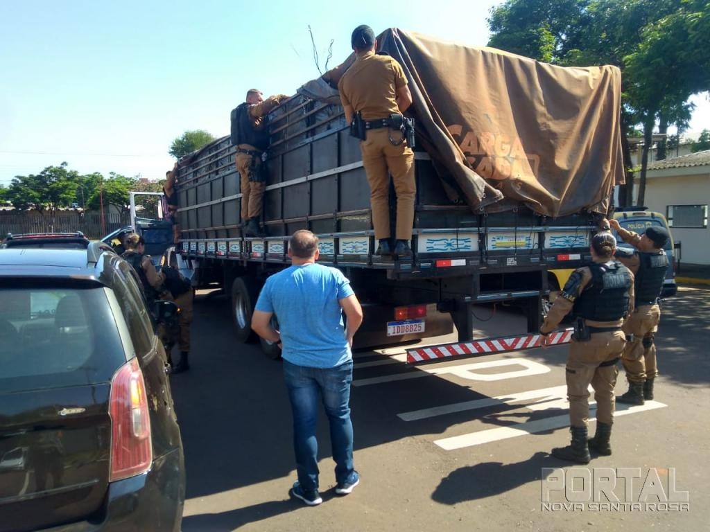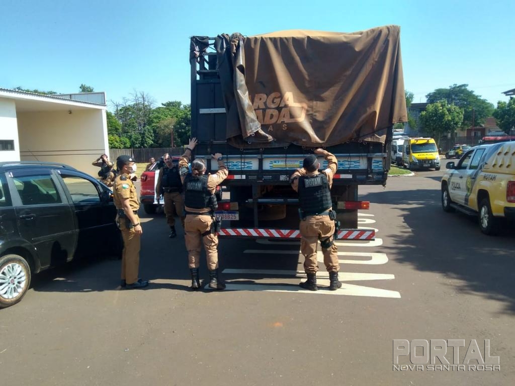 Enquanto os policiais conversavam com o suspeito, foi visualizado o veículo Mercedes Bens 1214 da cidade de Maringá, que após ser realizada a abordagem foi feito contato com o condutor, o qual foi perguntado o que estaria carregando e ele disse que estava carregado com aproximadamente 500 caixas de cigarros.