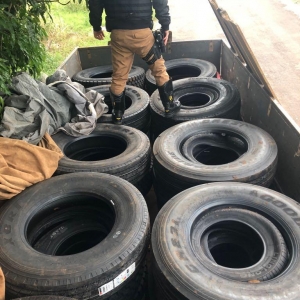 O caminhão VW/690 de cor amarela, licenciado no município de Guaíra, na carroceria do caminhão foram encontrados sob tabuas de madeiras 32 pneus de caminhão da marca Goodride e 17 pneus de automóveis da mesma marca e ainda 29 caixas de Whisky contendo 12 unidades cada caixa totalizando 349 unidades de diversas marcas, sem o devido desembaraço aduaneiro.