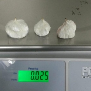 No veículo estavam as pessoas três pessoas, dois maiores e um menor de idade, em busca pessoal nada de ilícito com eles foi localizado. Porem todos demostravam muito nervosismo ao serem indagados se havia algo de errado no veículo, diante da suspeita de haver algo escondido no veículo foi feito uma busca minuciosa e então localizado no forro do teto parte interna escondido em baixo da forração três buchas de cocaína, que pesadas totalizaram vinte e cinco gramas (0,25gr).