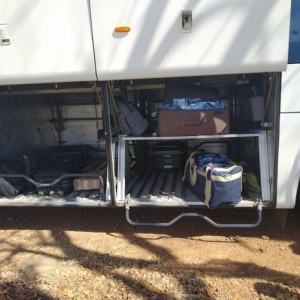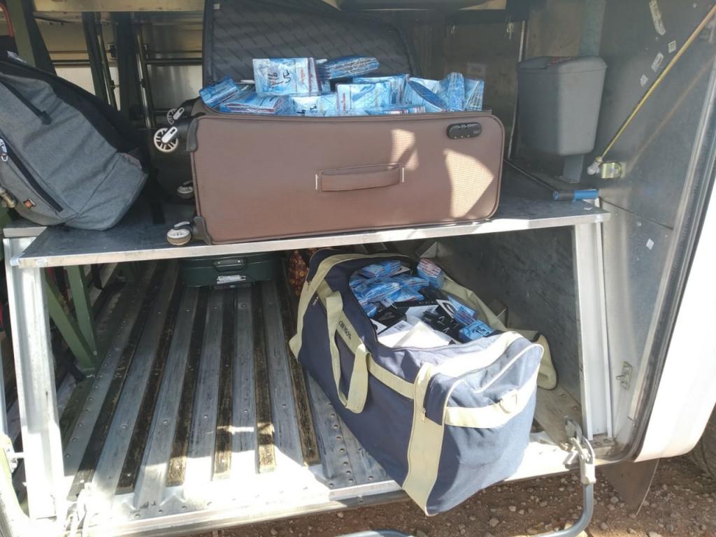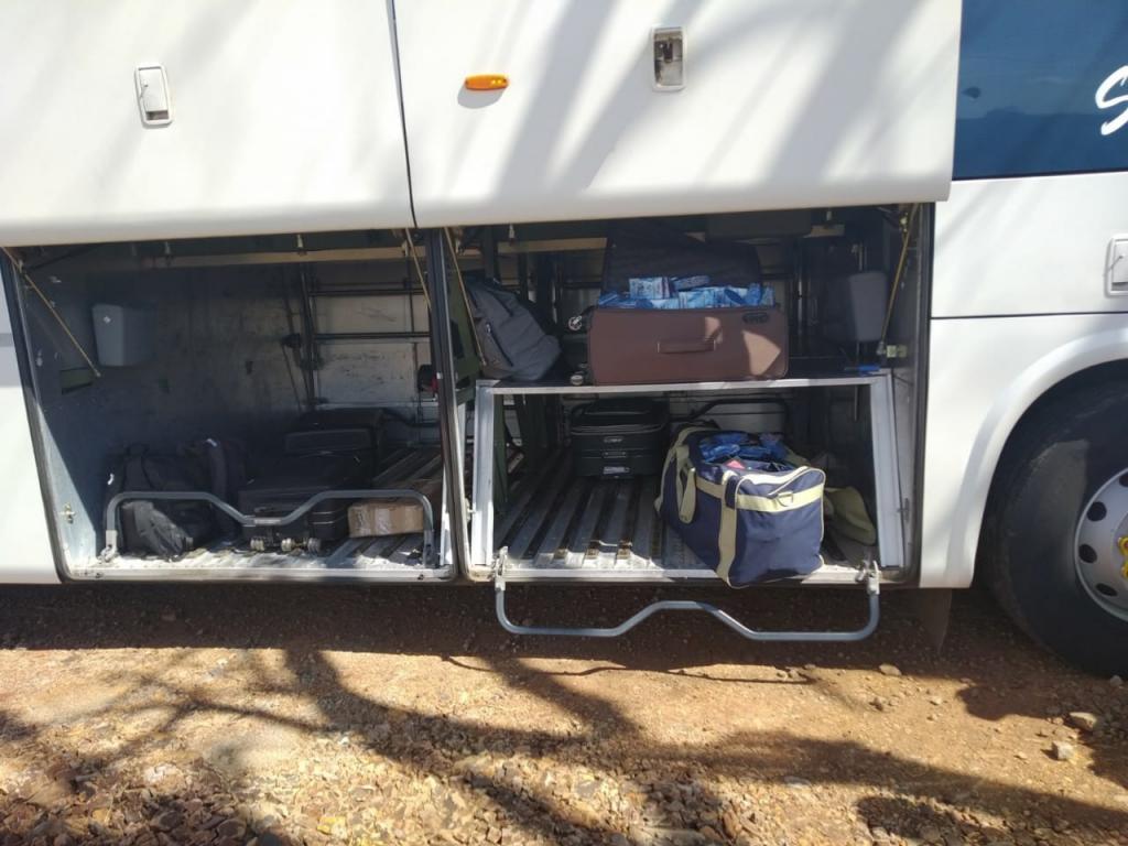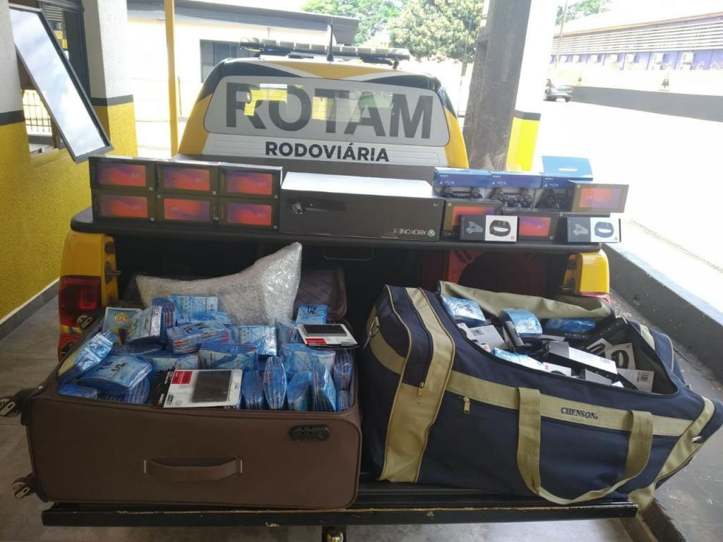 Após vistoria no bagageiro externo, foram localizadas duas malas contendo eletrônicos diversos (acessórios de vídeo game, cartão de memória, relógios e celulares).