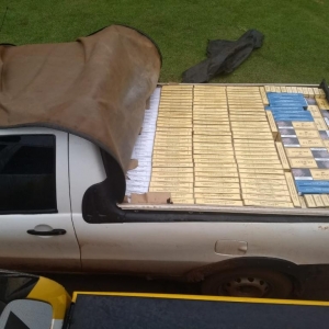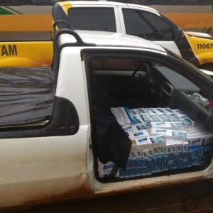 Durante revista foram localizados na caçamba e interior da caminhonete cerca de 16.000 maços de cigarros contrabandeados do Paraguai.