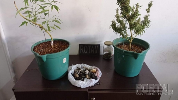 Dentro do imóvel, na parte dos fundos foram encontrados 2 pés de maconha e uma certa quantidade de maconha pronta para consumo.