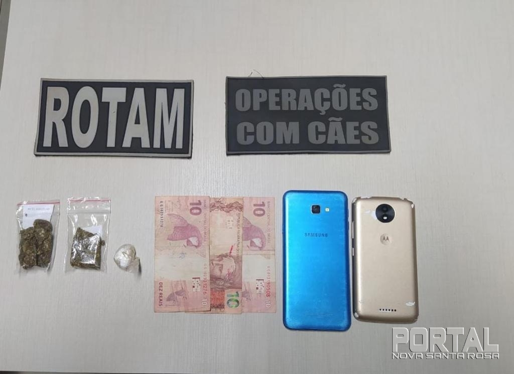 A PM localizou uma quantia de R$ 30,00 em dinheiro e uma porção de maconha pesando 0,24 grama e uma pedra de cocaína pesando 0,10 grama, no bolso de um dos jovens, com o outro rapaz foi localizado a quantia de 0,28 grama de maconha com embalagem igual.