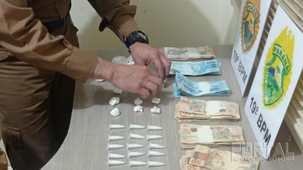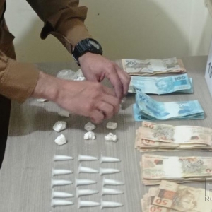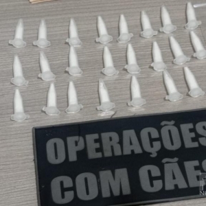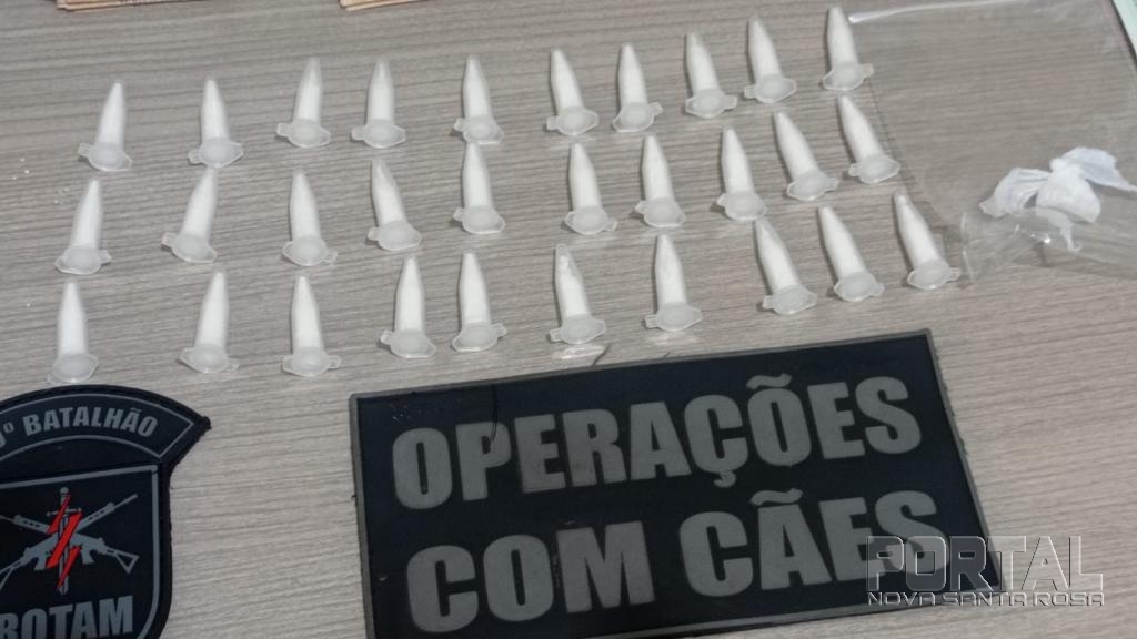 Com apoio do cão de faro, Boris, foram feitas buscas na residência, onde foram encontrados 30 pinos de cocaína pesando aproximadamente 59 gramas em um armário da cozinha.