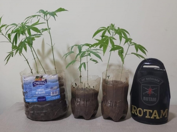Com base em informações fornecidas pelo suspeito, a equipe se deslocou até sua residência, onde localizou outro homem, de 27 anos, e apreendeu três potes plásticos com oito pés de cannabis sativa (maconha), com cerca de 30 a 40 centímetros de altura.