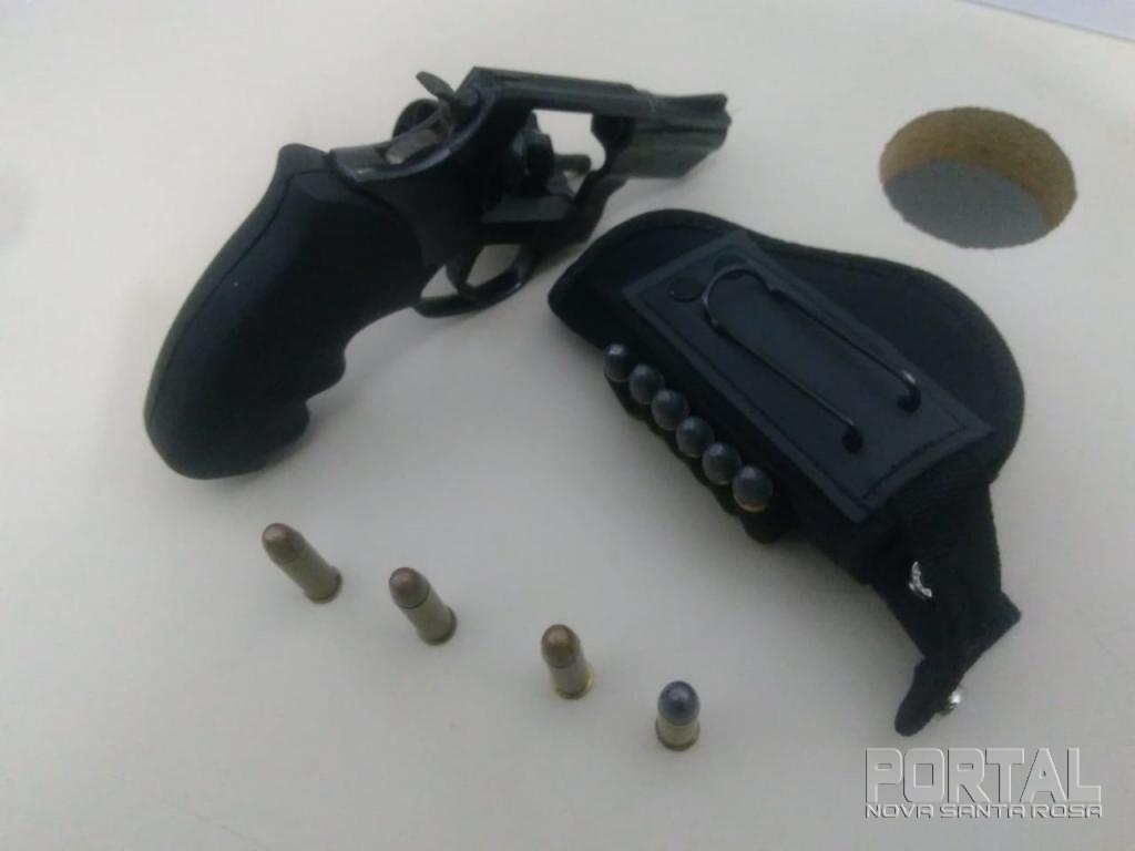 Foi então deslocado até a residência e durante buscas em cima do guarda-roupas foi encontrado um revólver Taurus cal .38 Special, municiado com 5 munições e mais cinco sobressalentes que estavam em um coldre.