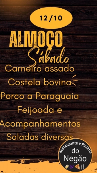 O Restaurante e Pizzaria do Negão estará servindo almoço neste sábado feriado nacional, no buffet, opções especiais, Carneiro Assado, Costela Bovina, Porco a Paraguaia, Feijoada e acompanhamentos.