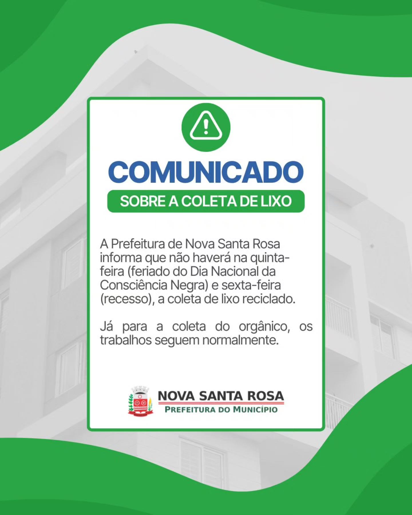 A Prefeitura de Nova Santa Rosa informa que não haverá coleta de lixo reciclado nesta quinta-feira (20), devido ao feriado do Dia Nacional da Consciência Negra, e na sexta-feira (21), em razão do recesso municipal.