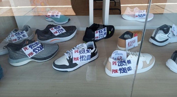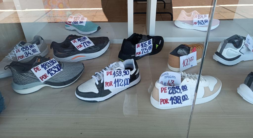 A vitrine chama a atenção pelos valores promocionais, com descontos significativos em relação aos preços originais, facilitando a compra de calçados confortáveis e de qualidade. A promoção inclui diferentes estilos, cores e numerações, atendendo a todos os gostos e necessidades.
