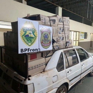 Na noite de segunda-feira (02), policiais militares do BPFRON - Batalhão de Polícia de Fronteira em ação integrada com policiais federais realizavam patrulhamento na área rural de Guaíra, quando localizaram um veículo Santana daptado para o contrabando e carregado com aproximadamente 2.100 pacotes de cigarros contrabandeados, resultando num prejuízo aproximado de R$ 120.000,00 ao crime organizado local.