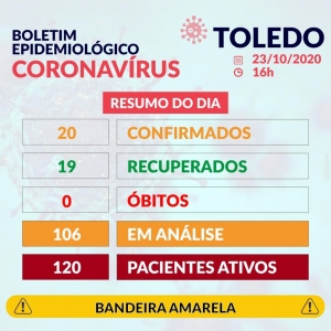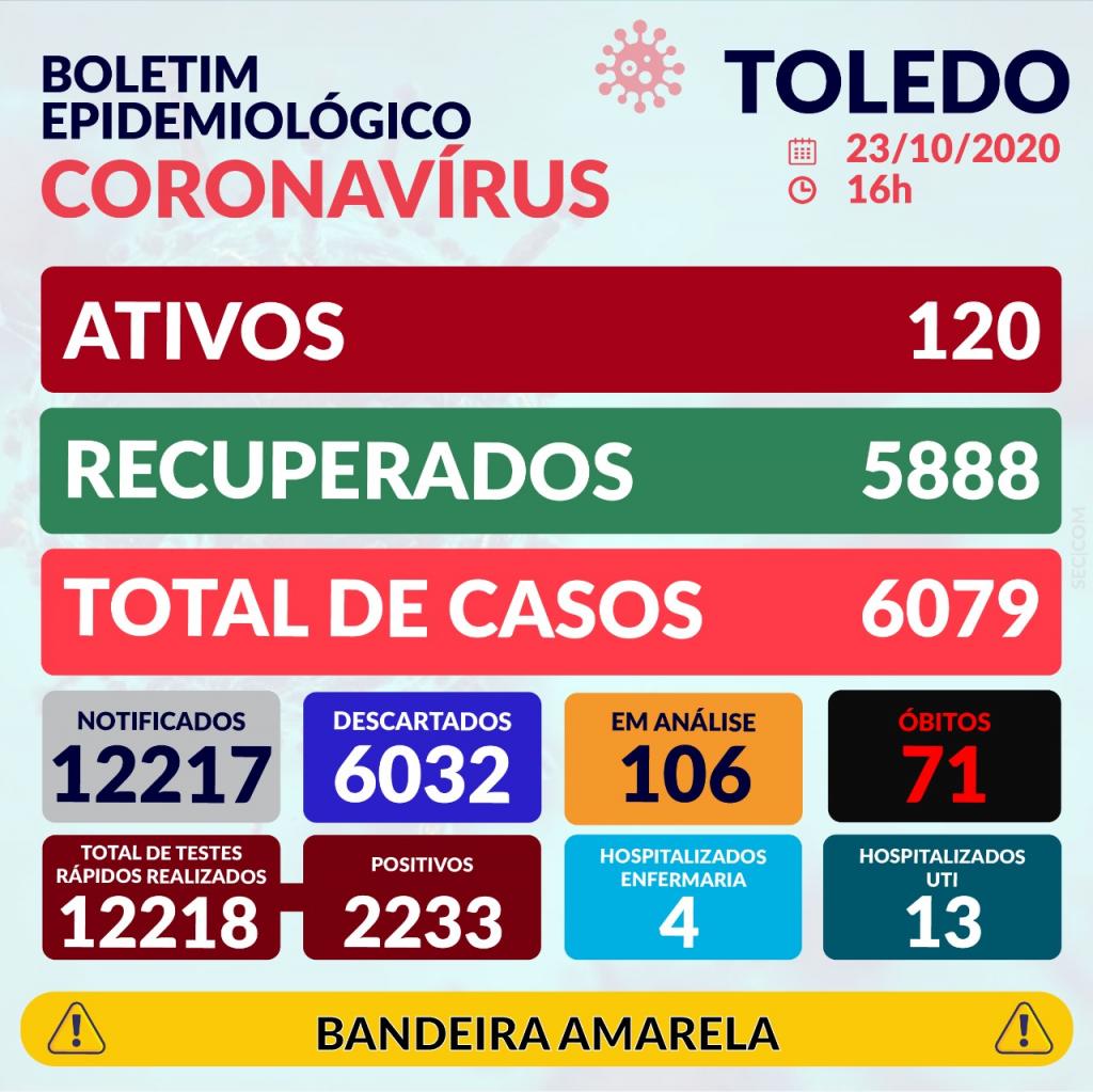Até o momento são 120 pacientes ativos com 71 óbitos, Toledo já teve 5.888 pacientes recuperados dos 6.079 infectados. Em investigação com suspeita do vírus estão 106 pacientes.