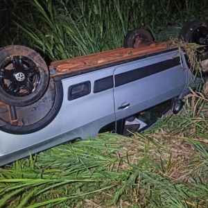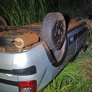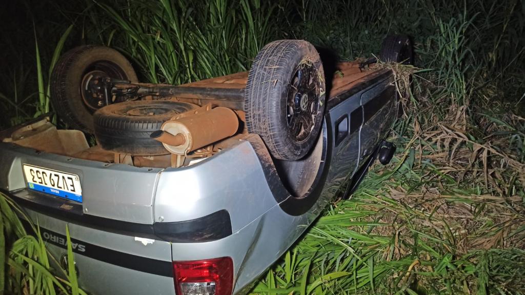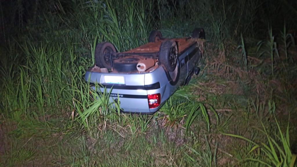 De acordo com informações, o condutor do Saveiro perdeu o controle da direção do veículo em uma curva e o carro capotou parando com as rodas pra cima.
