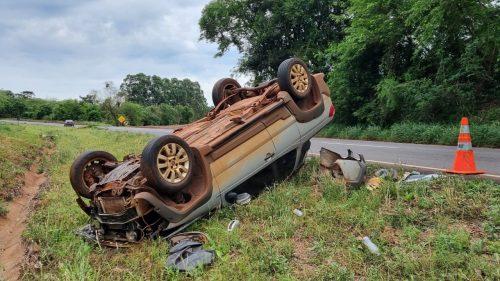 O veículo, que ficou completamente destruído e parou com as quatro rodas viradas para cima, segue abandonado no canteiro central da rodovia, várias horas após o ocorrido.