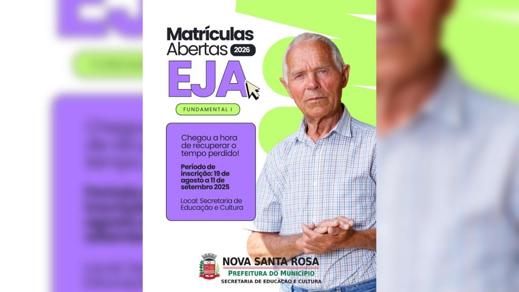 A Secretaria de Educação e Cultura de Nova Santa Rosa está realizando a busca ativa de interessados em cursar o EJA – Fase I (Educação de Jovens e Adultos) no ano letivo de 2026. A iniciativa é voltada para pessoas que não tiveram a oportunidade de concluir os anos iniciais do Ensino Fundamental e desejam retomar os estudos.