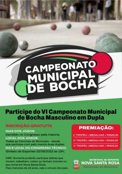A Secretaria de Esportes de Nova Santa Rosa convida todos os atletas do município que queiram participar do VI Campeonato Municipal de Bocha Masculino em Dupla. O congresso técnico acontece às 19h de terça-feira, dia 2 de agosto, no Ginásio de Esportes. A inscrição para participar é gratuita.