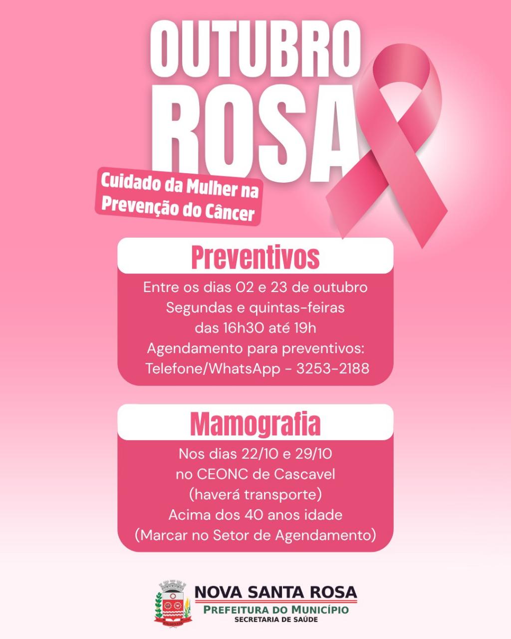 A Prefeitura de Nova Santa Rosa, por meio da Secretaria de Saúde, reforça às mulheres do município a importância da participação nas ações do Outubro Rosa, especialmente nos exames preventivos e de mamografia.