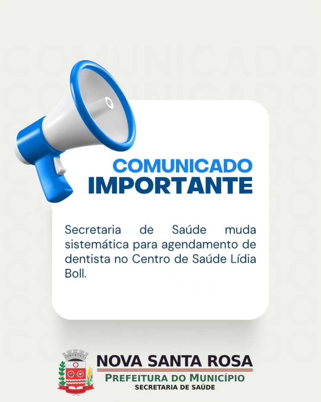 A Prefeitura de Nova Santa Rosa, por meio da Secretaria de Saúde, comunica que a forma de agendamento para consultas odontológicas no Centro de Saúde Lídia Boll passará por mudanças.