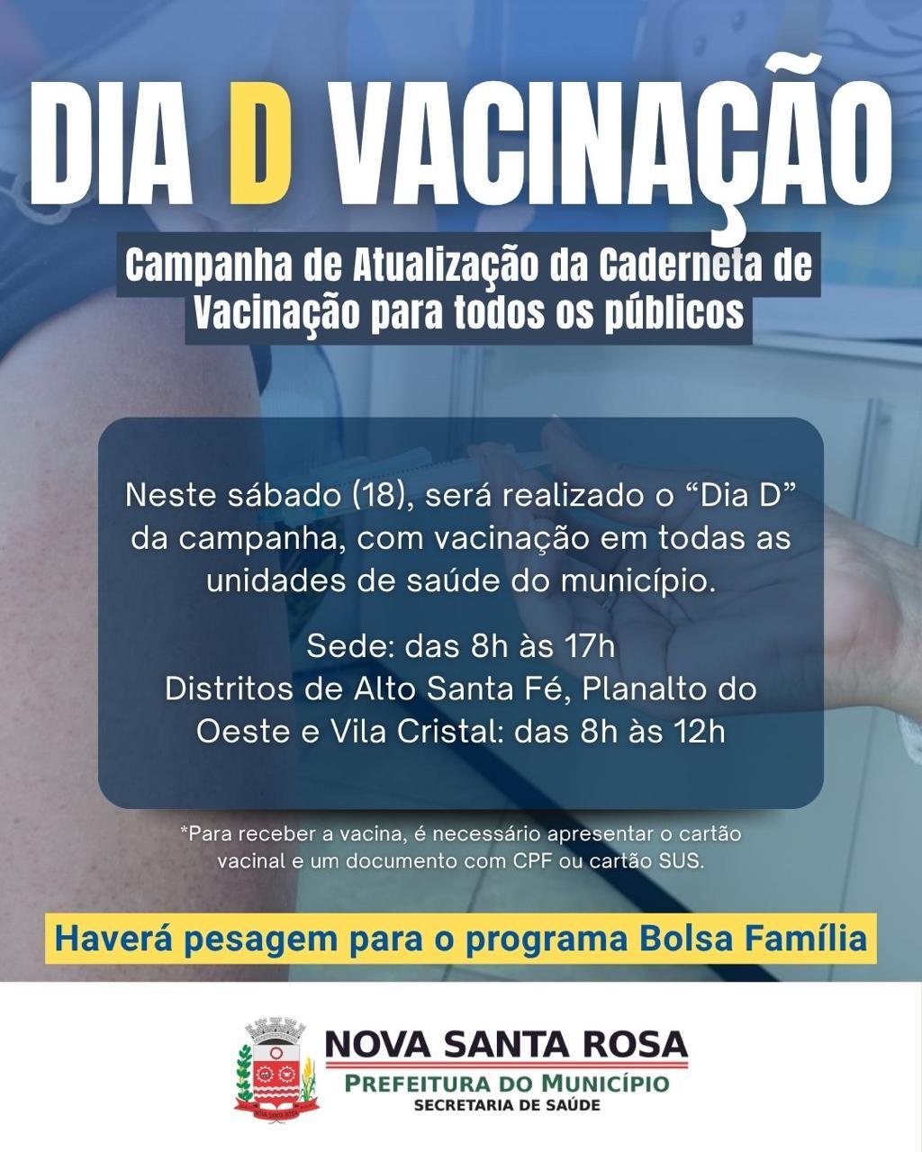 A Prefeitura de Nova Santa Rosa, por meio da Secretaria de Saúde, realizará neste sábado (18) o “Dia D” de Vacinação, dentro da Campanha de Atualização da Caderneta de Vacinação para todos os públicos.