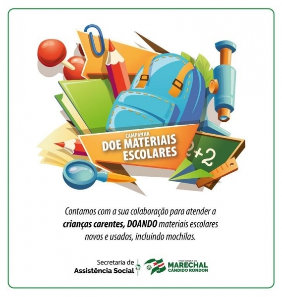 A campanha “Doe Materiais Escolares” segue em Marechal Rondon. Trata-se de uma iniciativa da Secretaria de Assistência Social, que objetiva arrecadar materiais escolares, novos ou usados, tais como lápis, borracha, caneta, lápis de cor, caderno, apontador, régua, mochila, entre outros, para serem doados para crianças carentes do município.
