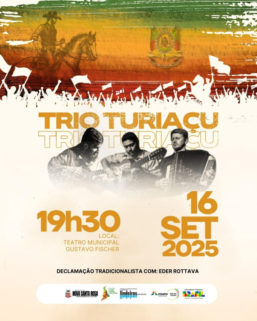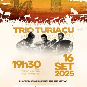 Na terça-feira (16), às 19h30, o Teatro Municipal será palco de um espetáculo cultural com o renomado Trio Turiaçu e a Declamação Tradicionalista de Éder Rottava. A entrada é gratuita.