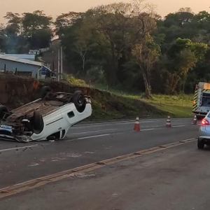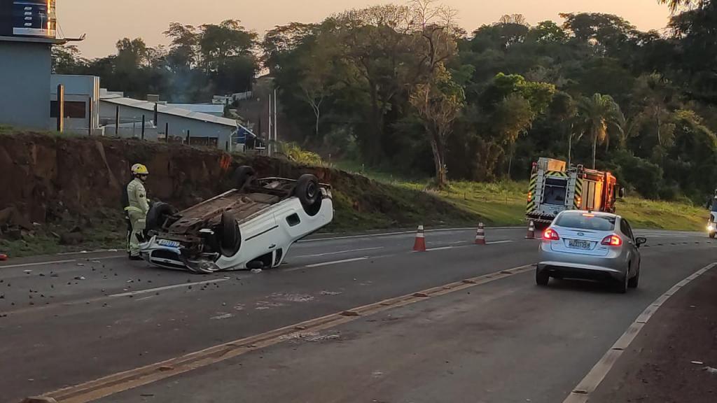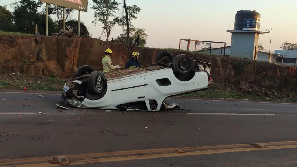 O utilitário Montana ficou com as rodas para cima após tombar no final da tarde de hoje, na rodovia que liga Marechal Rondon ao distrito de Curvado, proximidades do Batalhão de Polícia de Fronteira.