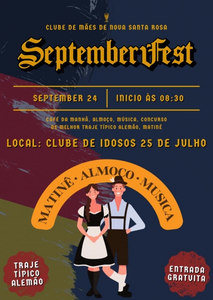 Nova Santa Rosa se prepara para celebrar a tradição e a cultura alemã com a Septemberfest, organizada pela Secretaria de Assistência Social do município. O evento será realizado nos dias 24 e 25 de setembro, a partir das 8h30, no Clube de Idosos 25 de Julho, com entrada gratuita. Na quarta-feira dia 24 o evento será para os Clube de Mães e na quinta-feira dia 25 para a terceira idade.