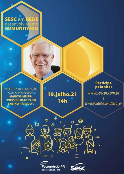 O primeiro encontro terá como tema “As Possibilidades do Ensino Híbrido”, será realizado no dia 19 de julho, a partir das 14h, com o professor, psicólogo, mestre em Educação, escritor, palestrante, Marcos Meier, com transmissão pelo canal do Sesc PR no Youtube.