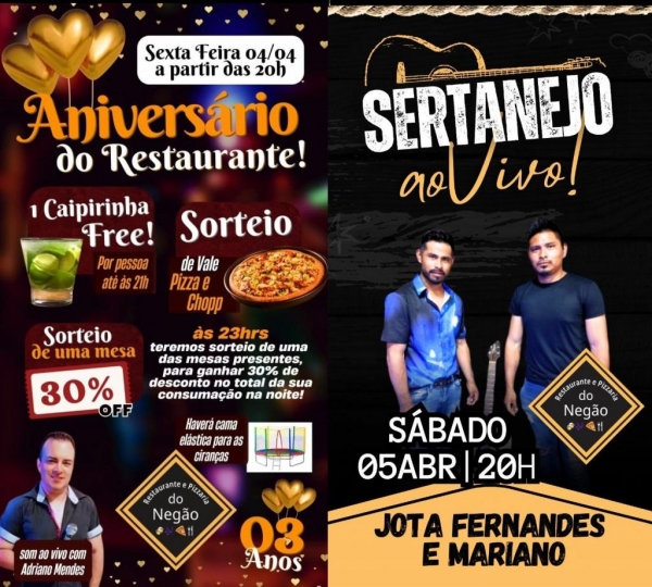 O Restaurante e Pizzaria do Negão prepara uma festa especial para comemorar seus três anos de história. A celebração acontece neste final de semana, hoje e amanhã, dias 4 e 5 de abril, e promete atrair a comunidade com uma programação recheada de atrações, promoções exclusivas e música ao vivo.