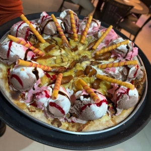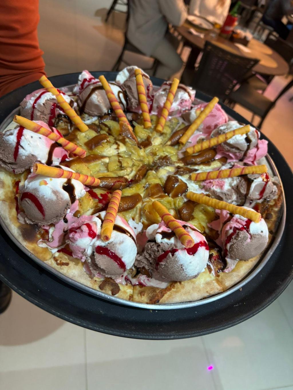 Entre os destaques está a pizza de sorvete, uma sobremesa que se tornou marca registrada do rodízio: massa crocante, recheio doce e bolas de sorvete com cobertura, preparada para encerrar a experiência de forma inesquecível.