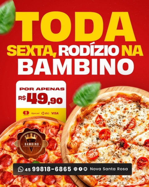 Em Nova Santa Rosa, a sexta-feira tem sabor especial no Bambino Pizzaria e Choperia. Pelo valor de R$ 49,90 por pessoa, os clientes podem aproveitar o tradicional rodízio de pizzas, que reúne sabores clássicos, especiais e também opções doces que conquistam todos os paladares.