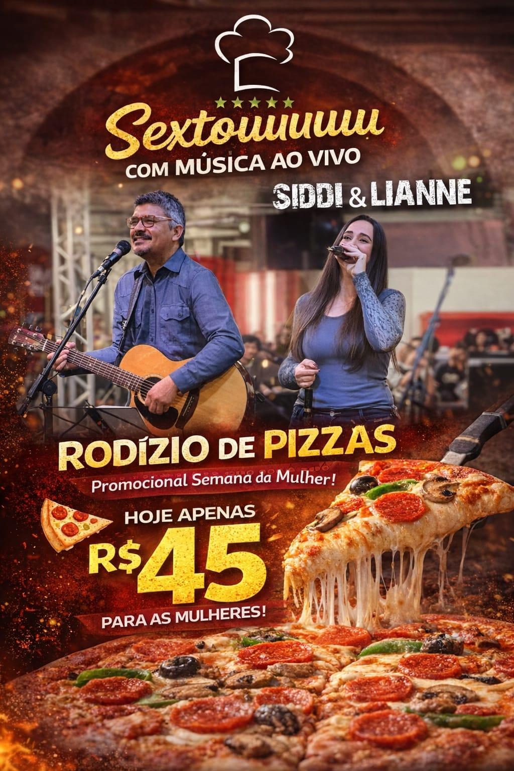 A programação faz parte da promoção da Semana da Mulher e traz uma condição especial para o público feminino. Somente nesta sexta-feira, o rodízio de pizzas sai pelo valor promocional de R$ 45 para as mulheres.