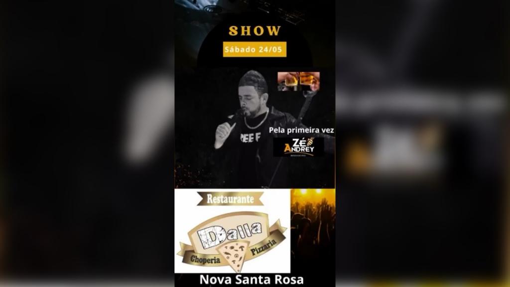 O Restaurante e Pizzaria Dalla, tradicional ponto de encontro em Nova Santa Rosa, recebe na noite deste sábado (24), o cantor Zé Andrey para um show inédito na cidade. Esta será a primeira apresentação do artista no local, prometendo animar o público com um repertório repleto de sucessos da música ao vivo.