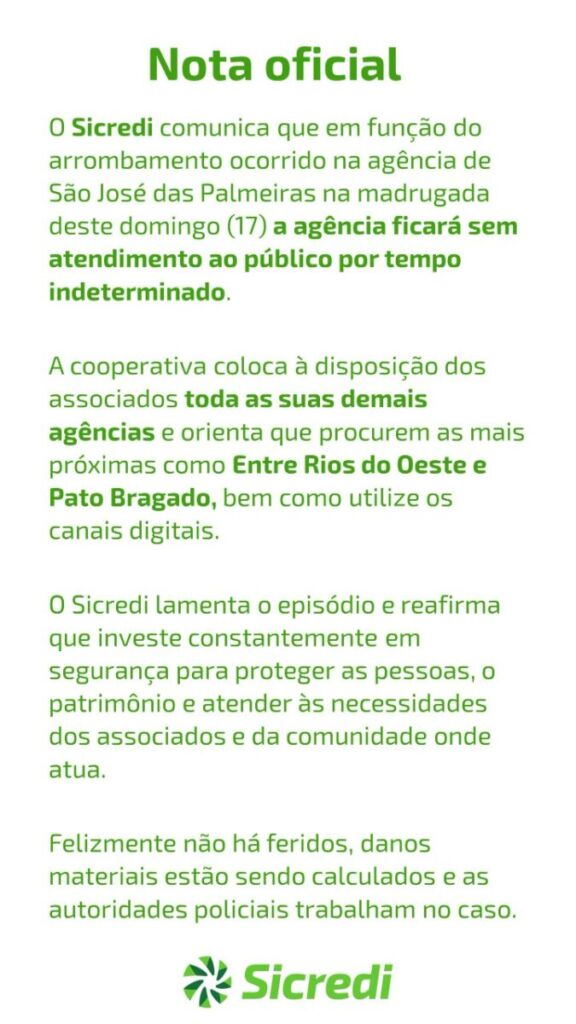 O Sicredi comunica que em função do arrombamento ocorrido na agência de São José das Palmeiras na madrugada deste domingo (17) a agência ficará sem atendimento ao público por tempo indeterminado.