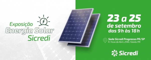 A Sicredi Progresso PR/SP realizará uma Exposição de Energia Solar em Toledo. O evento acontece de 23 a 25 de setembro, na sede da Cooperativa, na Rua Treze de Abril, 2590 - sentido Lago Novo, das 9h às 18h. Toda a comunidade está convidada a participar e saber mais sobre essa alternativa sustentável que tem ajudado a driblar os sucessivos aumentos na conta de energia, tanto no campo como na cidade.