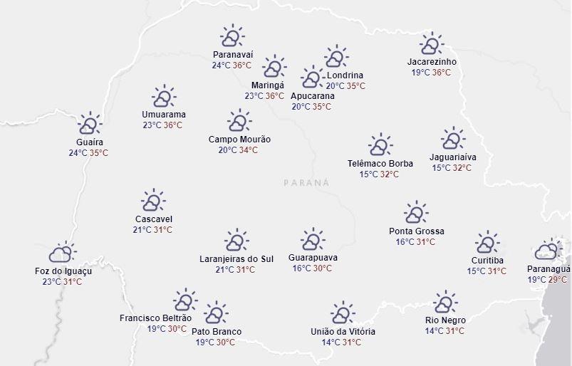 Em Marechal Cândido Rondon e Nova Santa Rosa a previsão desta quarta-feira é de 24°C a mínima e a máxima de 35°C, segundo o Simepar.