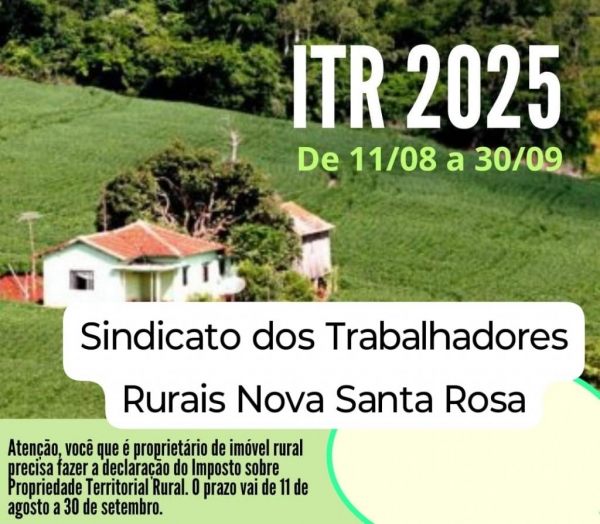 O Sindicato dos Trabalhadores Rurais de Nova Santa Rosa comunica que o prazo final para a entrega da Declaração do Imposto sobre a Propriedade Territorial Rural (ITR) encerra no dia 30 de setembro.