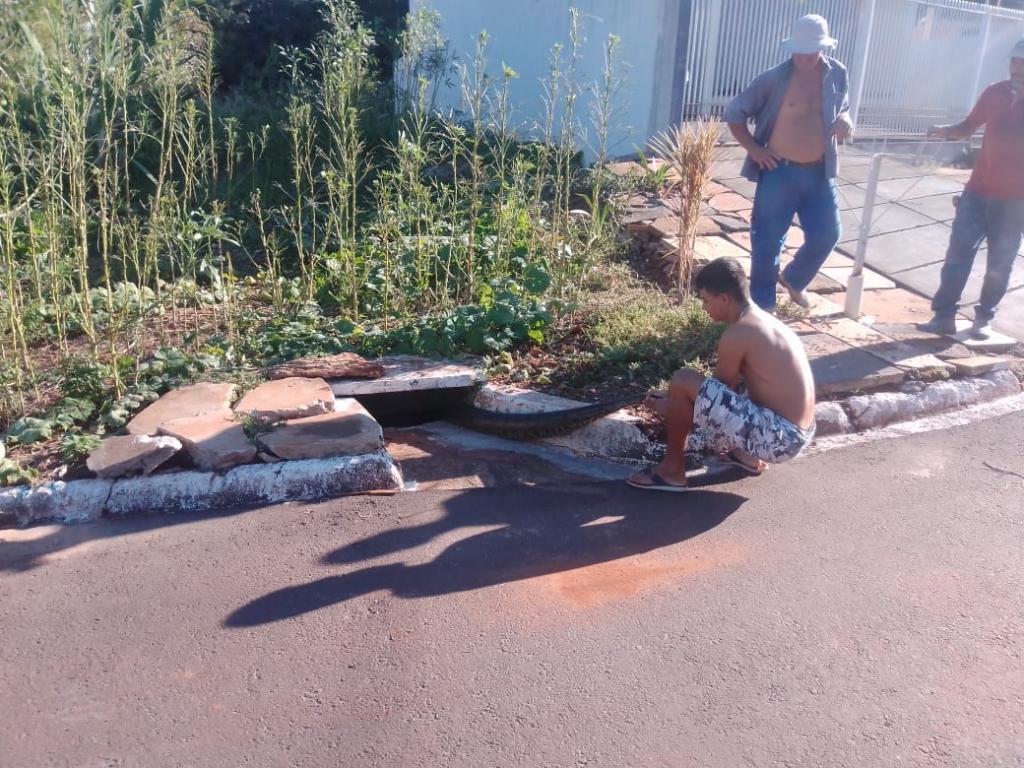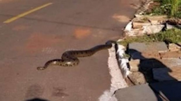 Os moradores do Bairro Jardim Sete Quedas, em Guaíra, estão assustados com o aparecimento de uma cobra da espécie Sucuri registrada na terça-feira (21) atravessando a rua após sair de um bueiro.